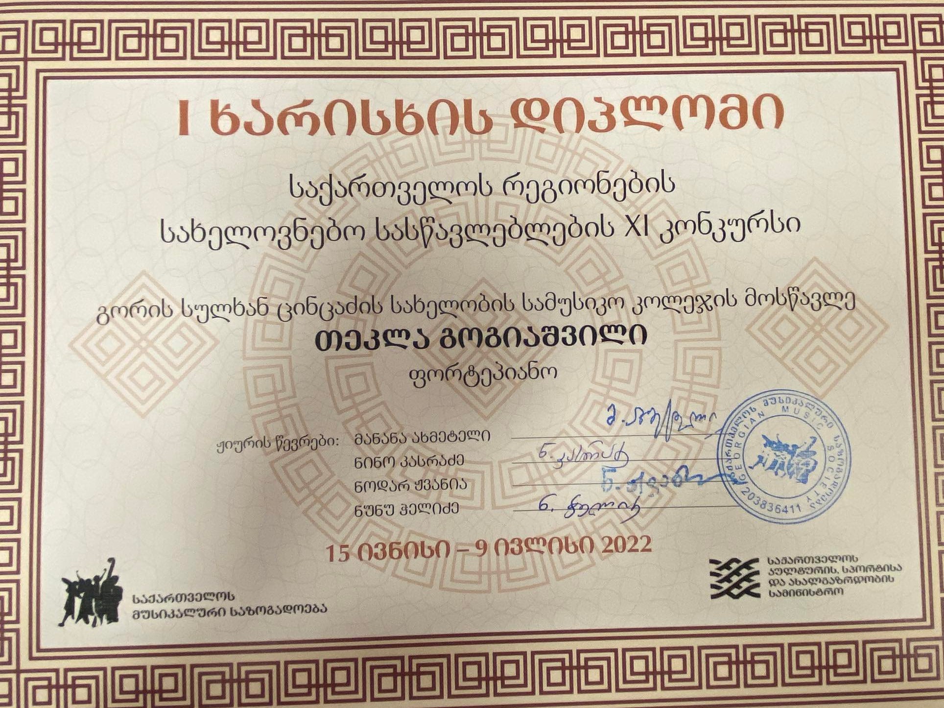 I ხარისხის დიპლომი მიენიჭა ფორტეპიანოს სპეციალობის