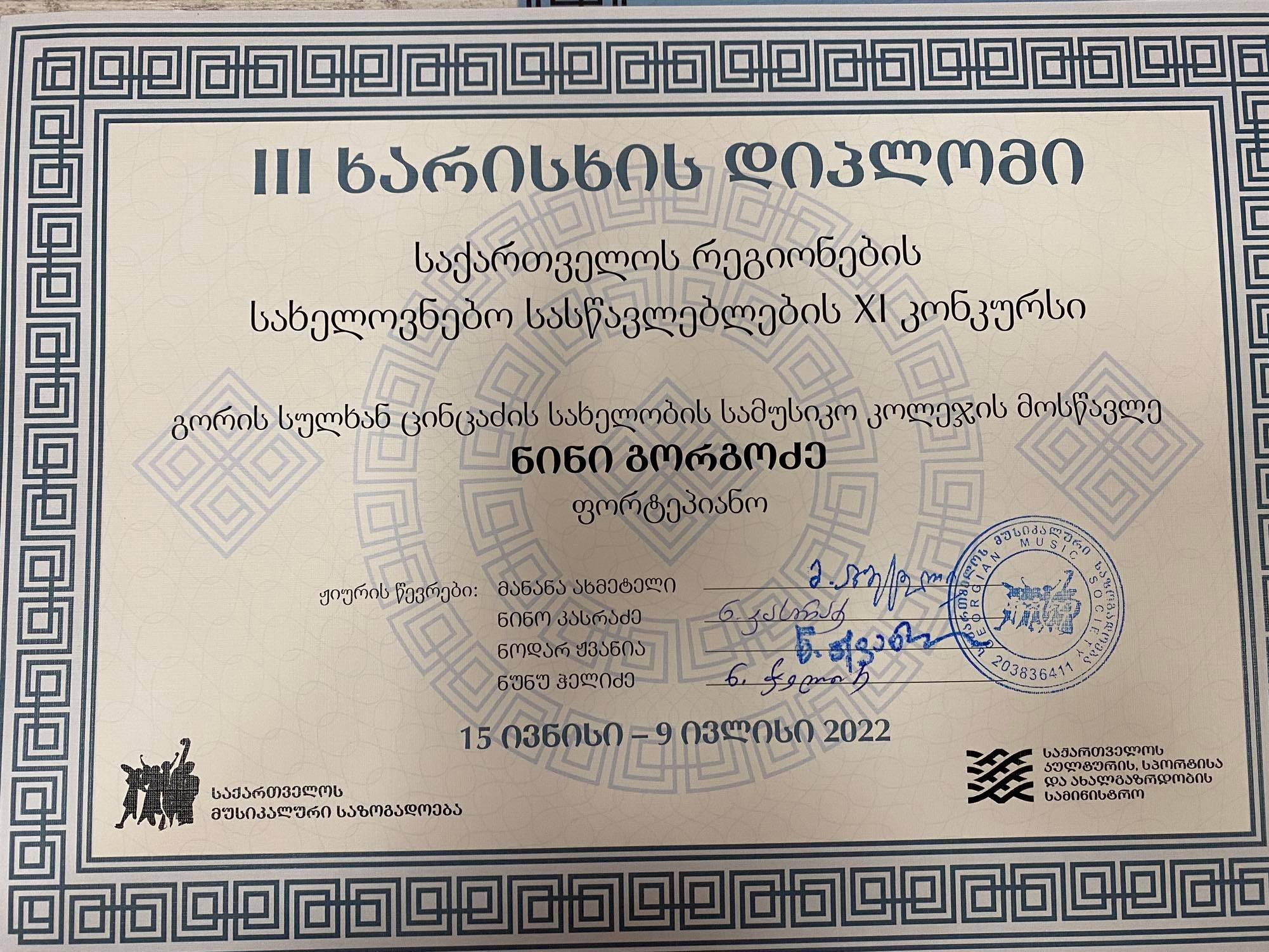III ხარისხის დიპლომი გადაეცა საორკესტრო სპეციალობის IV კლასის მოსწავლეს,