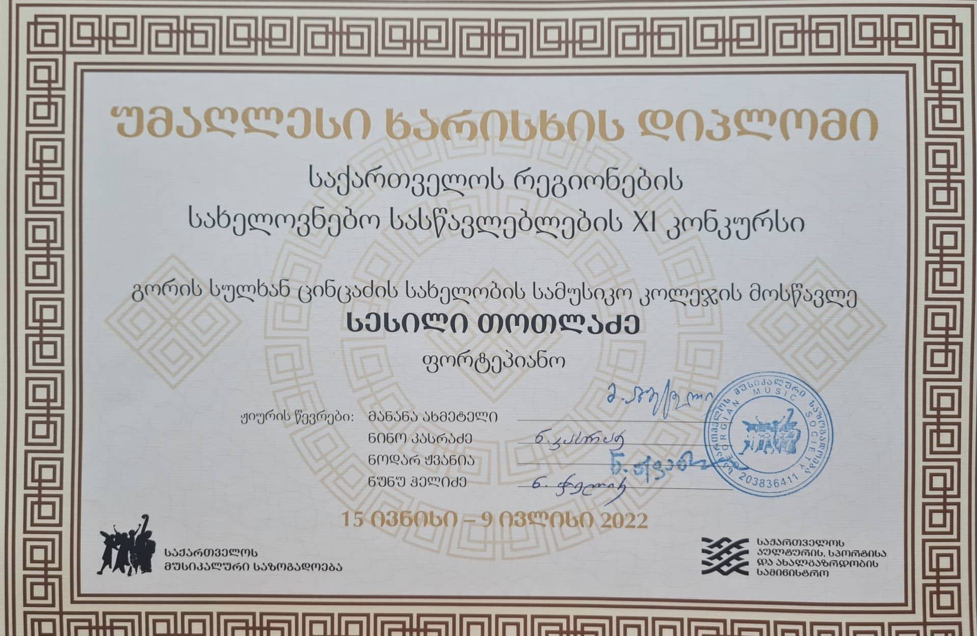 უმაღლესი ხარისხის დიპლომი გადაეცა ფორტეპიანოს სპეციალობის II კლასის მოსწავლეს,